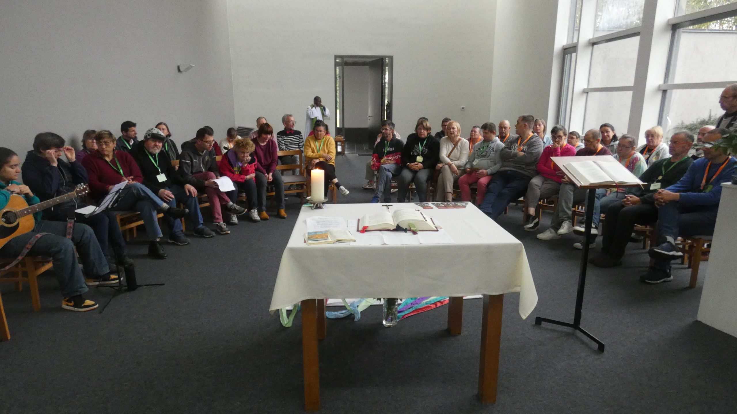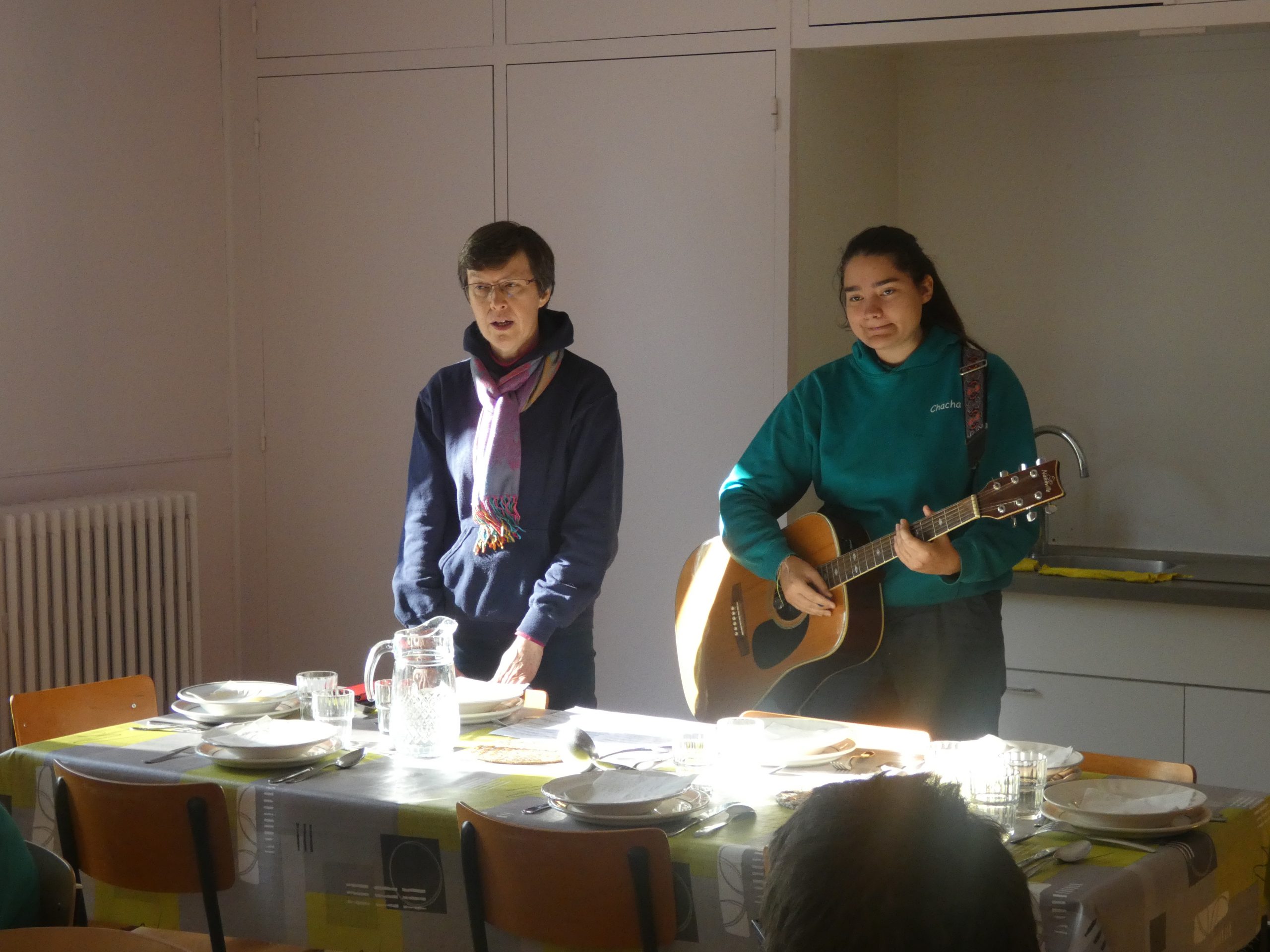 De retour, après un bon repas convivial, et pour les plus vaillants, une petite veillée animée par le Père Pierre Kungi et Charlotte, notre guitariste…