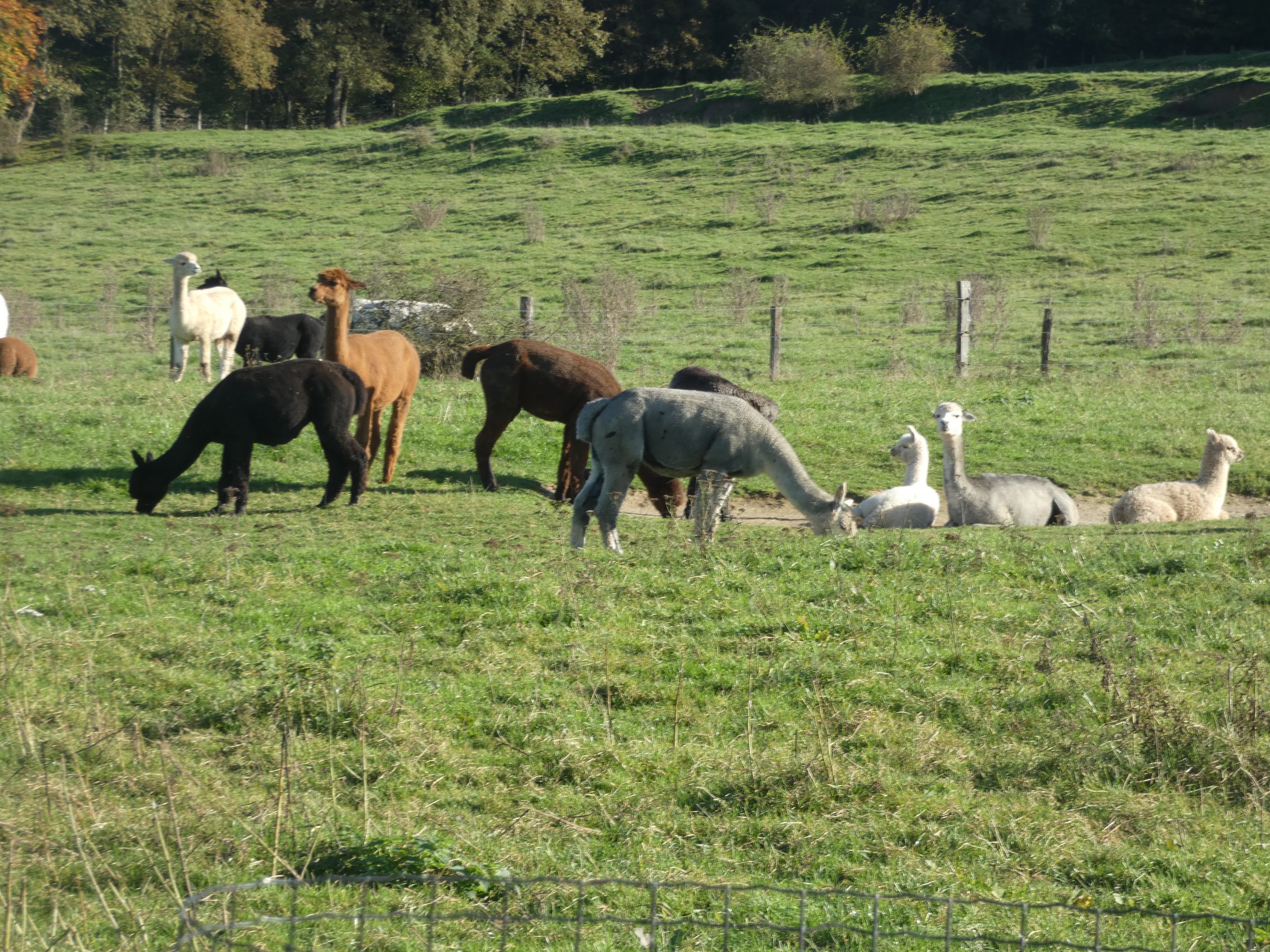 Le temps, l’après-midi, était de la partie, idéal pour se promener aux alentours : sur notre route, un troupeau surprenant d’alpagas, la rivière, tout un bois aux couleurs d’automne, le village et ses maisons aux belles pierres… Que du bonheur ! Mais le clou de cette après-midi et qui marquera encore longtemps beaucoup d’entre nous, ce fut la rencontre avec Frère Bart, de et à la Communauté de Tibériade à Lavaux Ste Anne : son accueil chaleureux, son histoire personnelle, son témoignage de foi partagé avec simplicité, humour et justesse, dans un cadre enchanteur interpellèrent Anne-Sophie, Vincent, Agnès, Domitille, Rémi, Hugues et tous les autres… Des paroles simples mais ô combien riches… Ainsi, nous raconta-t-il, d’où viennent les perles ?… d’une déficience, d’une blessure à laquelle le coquillage fait face en secrétant ce qui deviendra cette petite merveille ! Quelle image parlante pour celles et ceux que le handicap, les aléas de la vie menacent… Mais il y a la force et la lumière du Christ, toujours présent à leurs côtés et pour qui chacun est unique. Et de chacun, ce dernier peut faire jaillir des trésors de cœur. Cette magnifique rencontre se clôtura par un temps de prière dans leur chapelle à l’aménagement si particulier…