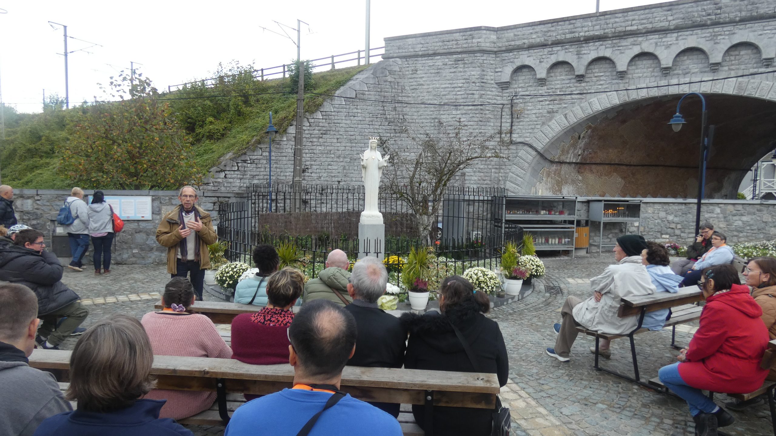 Pour conclure en beauté ces 2 journées, un petit arrêt à Beauraing et à son espace de prière « L’aubépine » tout nouvellement réaménagé… avec ce dernier « clin-Dieu » : l’abbé Rochette, recteur du sanctuaire, rencontré à l’improviste, nous pilota de la basilique au Centre marial et à sa vidéo sur les apparitions.